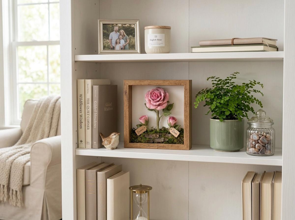 Personalized Felt Rose Shadow Box, Mom's Garden Keepsake, Needle Felted Flower Frame